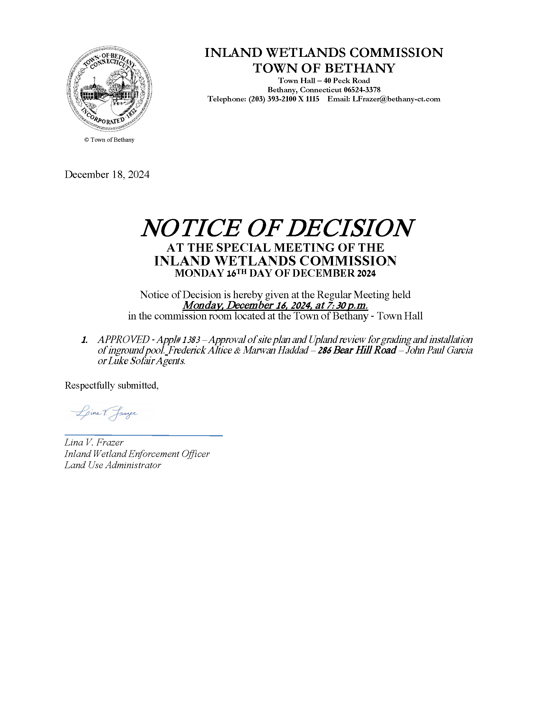 12/20/2024 - Notice of Decision - Inland Wetlands 12/16/2024