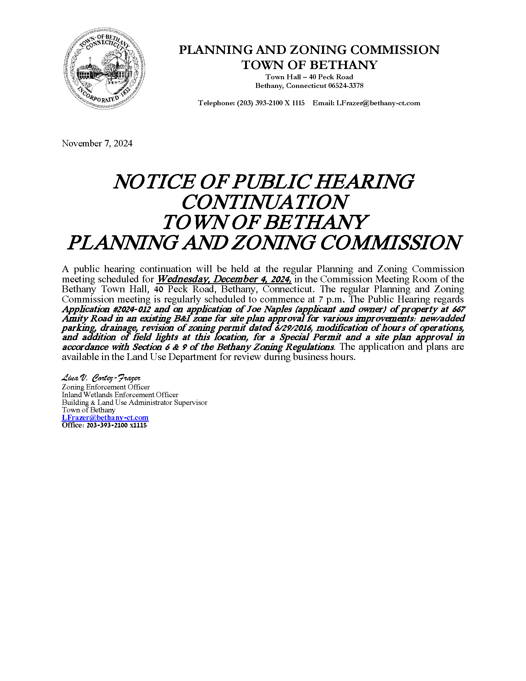 11/21/2024 - Notice of Public Hearing continuation - Planning & Zoning 12/4/2024