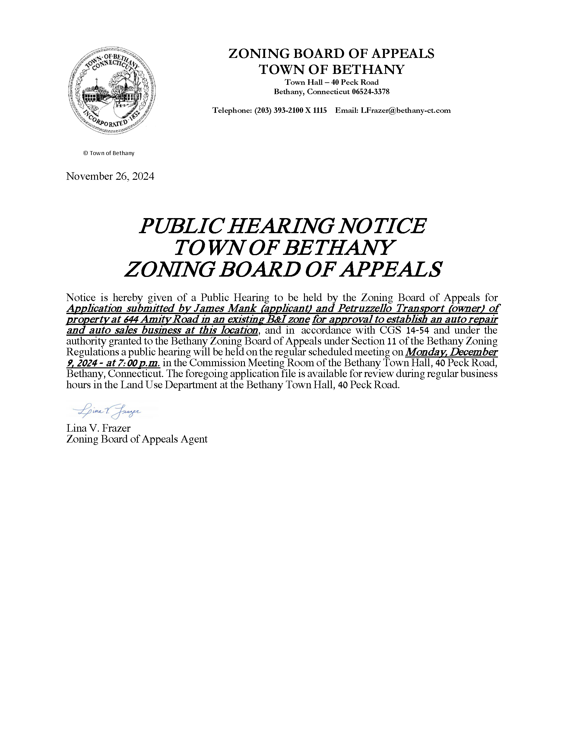 11/27/2024 - Notice of Public Hearing - Zoning Board of Appeals 12/9/2024