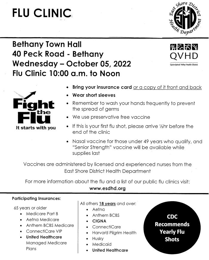 9/7/2022 - FLU CLINIC- OCTOBER 5,2022 AT BETHANY TOWN HALL